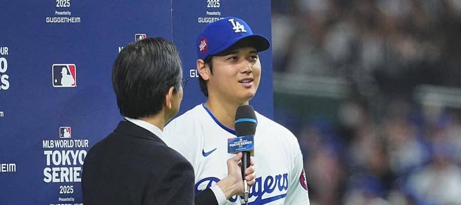 ドジャースの大谷翔平投手は19日、東京ドームで行われたカブスとの開幕第2戦に「1番・指名打者」で先発出場。5回の第3打席に右中間1号ソロを放つなど、3打数1安打1打点2四球だった。試合後にはグラウンドで行われたヒーローインタビューに登場。「本当に勝てて嬉しいですし、1本出てほっとしています」と話した。