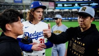阪神戦後に才木とコミュニケーションを図るグラスノー。(C)Getty Images MLBのワールドツアーの一環として開…
