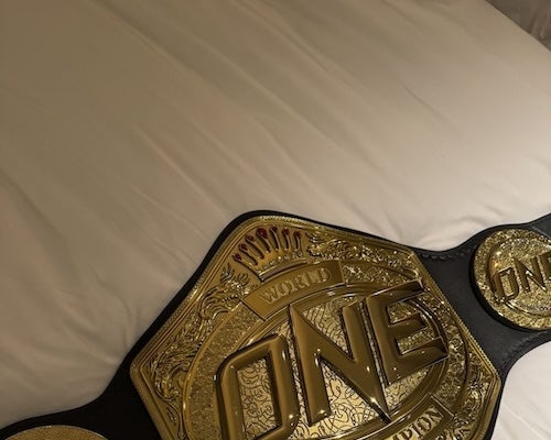 先日の試合で勝ち取ったチャンピオンベルトとともに喜びを報告した。