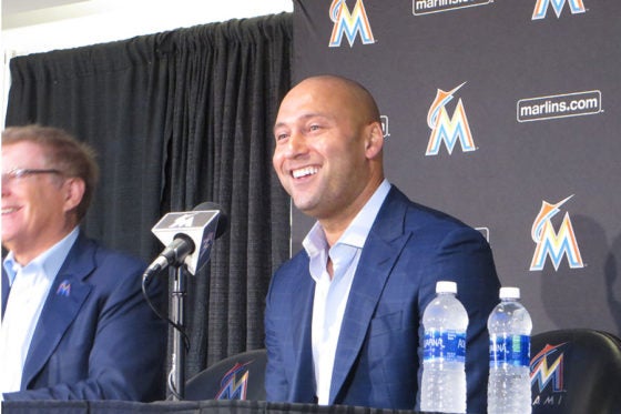 本拠地マーリンズパークで記者会見を行ったデレク・ジーター氏【写真:編集部】