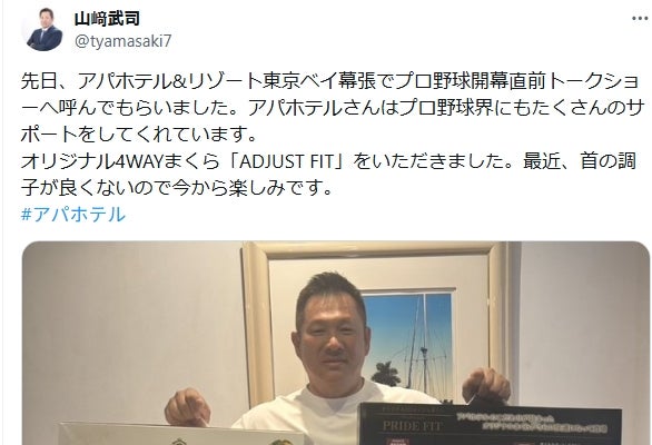 山﨑は「先日、アパホテル&リゾート東京ベイ幕張でプロ野球開幕直前トークショーへ呼んでもらいました」と投稿し、イベントでの経験を振り返った。また、アパホテルがプロ野球界へのサポートをしていることにも触れ、「アパホテルさんはプロ野球界にもたくさんのサポートをしてくれています」と感謝の意を表した。