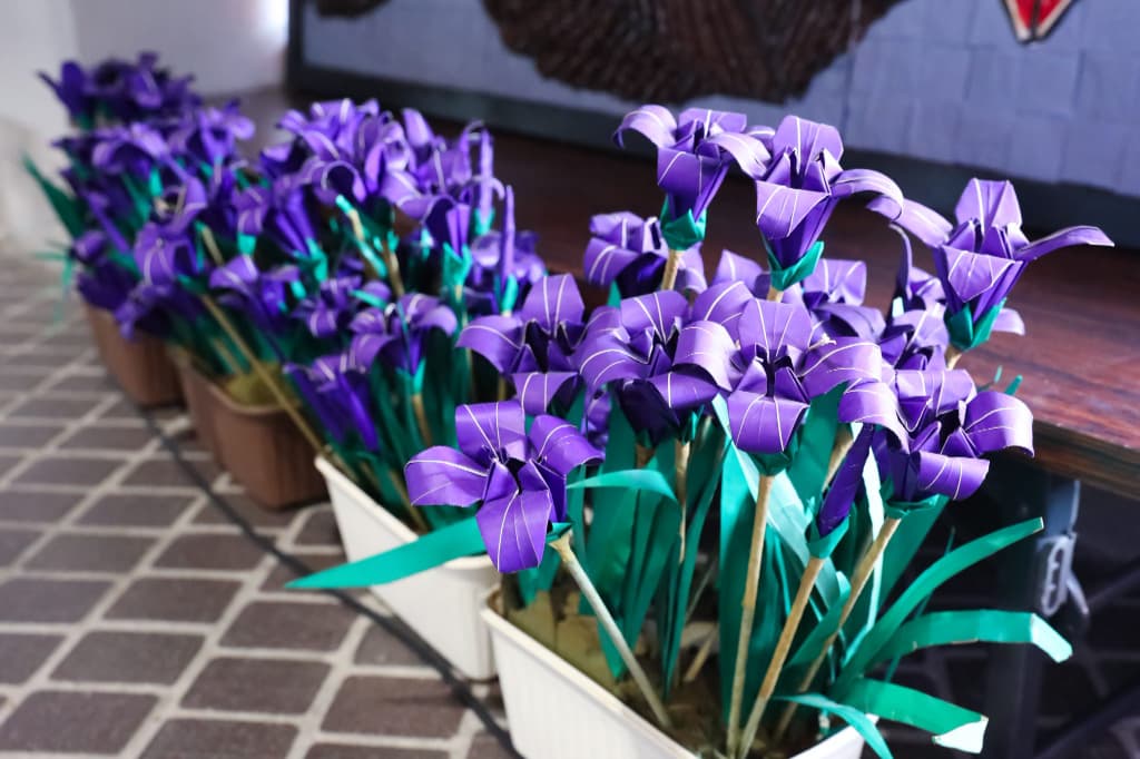 ロビーには刈谷東高校折り紙部の作品が展示された。10cmほどの小さなパーツを組み合わせて作られた全長2mほどの立体のアニメキャラクターや富嶽三十六景をモチーフにした屏風絵など大作の他に、ブレイヴキングス刈谷とのコラボレーションのために制作されたカキツバタの花など、折り紙の概念を変えるような作品がずらりと並ぶ。「刈谷市の小中高校向けの招待活動を行うで、どこかの学校にブースを出していただけないかと地域の学校についてリサーチしていました。その中で、刈谷東高校に折り紙部があることを知り、お声がけさせていただきました。カキツバタの花やブレイヴキングス刈谷とクインシーズ刈谷のマスコットを作っていただくなど、この機会に積極的に参加していただいて本当にありがたかったです。3月29日の試合では折り紙ワークショップを開催してもらうことになっています」と村永さん。