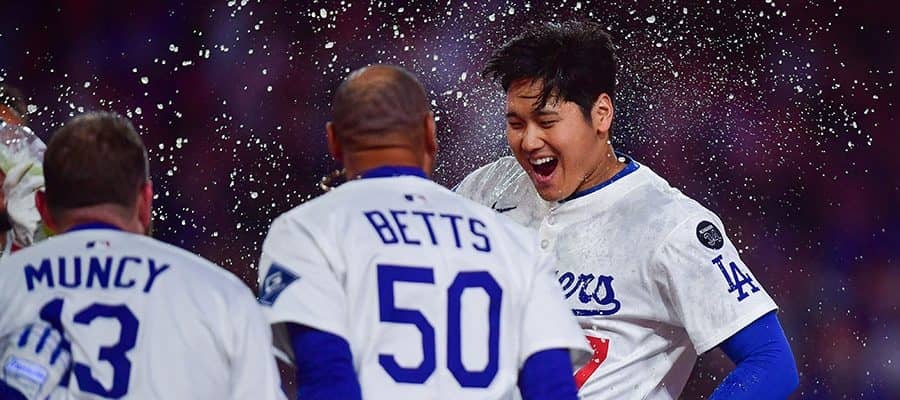 サヨナラ本塁打を放ち、ナインに迎えられるドジャース・大谷翔平【写真:ロイター】