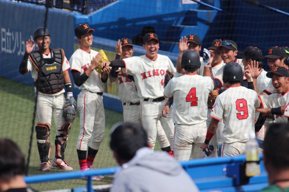 北阪の本塁打を祝福するベンチ。巻き返しのムードが生まれてきた 1回戦で4本塁打を浴びた日本大が、2回戦で勝ってタイに…