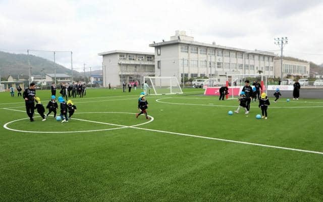 2日、3月末で閉校した浅口市立寄島中学校の跡地で「ファジアーノ岡山スポーツパーク寄島」の完成式典があった。フルサイズのサッカーグラウンドとフットサルコート2面が取れる多目的グラウンドには毛足の長い人工芝が敷き詰められている。今年度から校舎を改修し、更衣室や事務室を整備する。