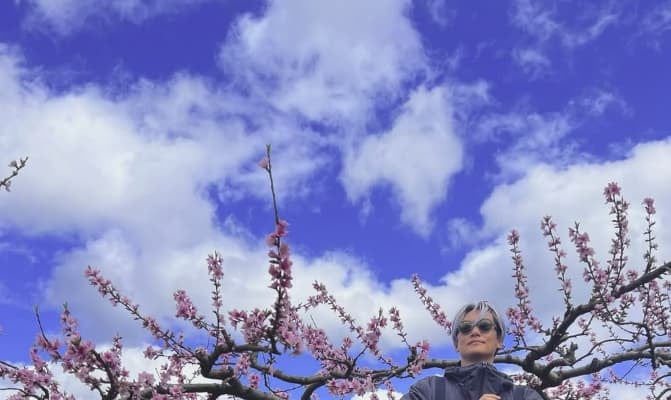 俳優の井浦新が、娘さんと桃の花を見に山梨県の桃農家を訪れた際の様子を捉えた写真である。2枚目と3枚目の写真では、桃の花が高画質でUPされていた。