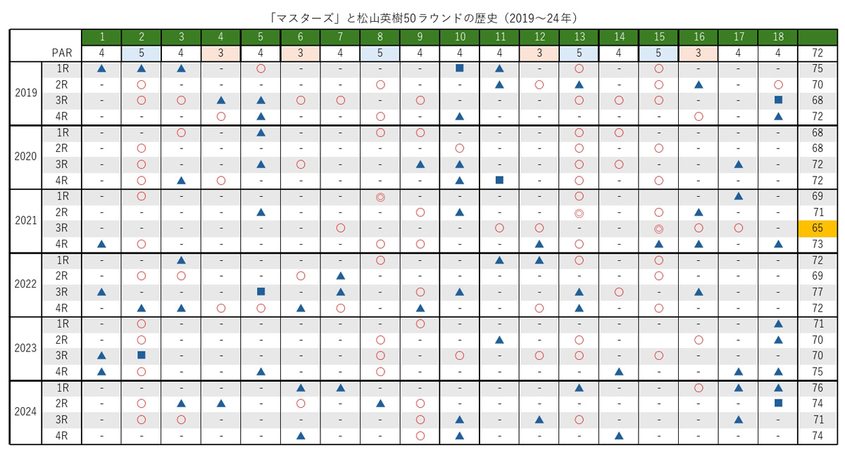 松山英樹にとって、2021年に続く大会2勝目を目指す14回目の「マスターズ」が始まる。当時アマチュアだった11年に初出場して以降、予選落ちは1回(14年)のみ。以降は10大会連続で決勝に進出し、その総ラウンド数は『50』にわたる。今回は松山の全50ラウンドを“総ざらい”し、これまでのスコア傾向を分析してみた。