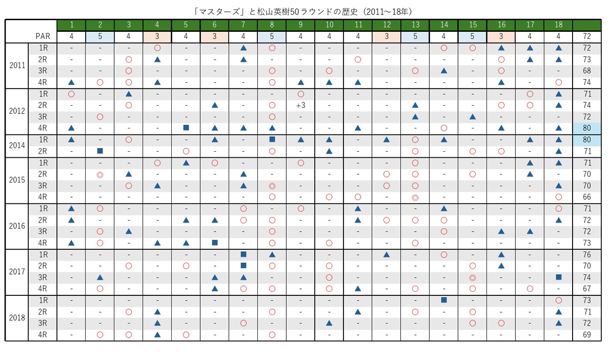 なお、パー5を除いて松山が通算アンダーパーを記録しているのは、パー4が3番(5アンダー)、9番(6アンダー)、14番(2アンダー)の3ホール。パー3は“アーメンコーナー”にある名物ホール、12番(2アンダー)のみとなっている。