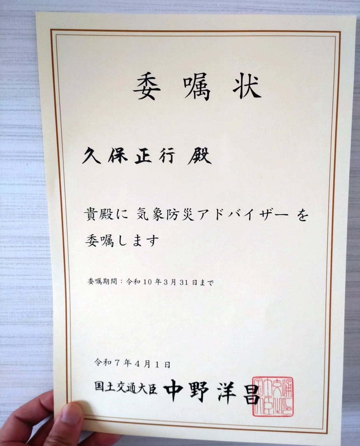 投稿では、「#気象 #防災 #気象防災アドバイザー #委嘱されました」とハッシュタグを添えて、就任の喜びを伝えている。