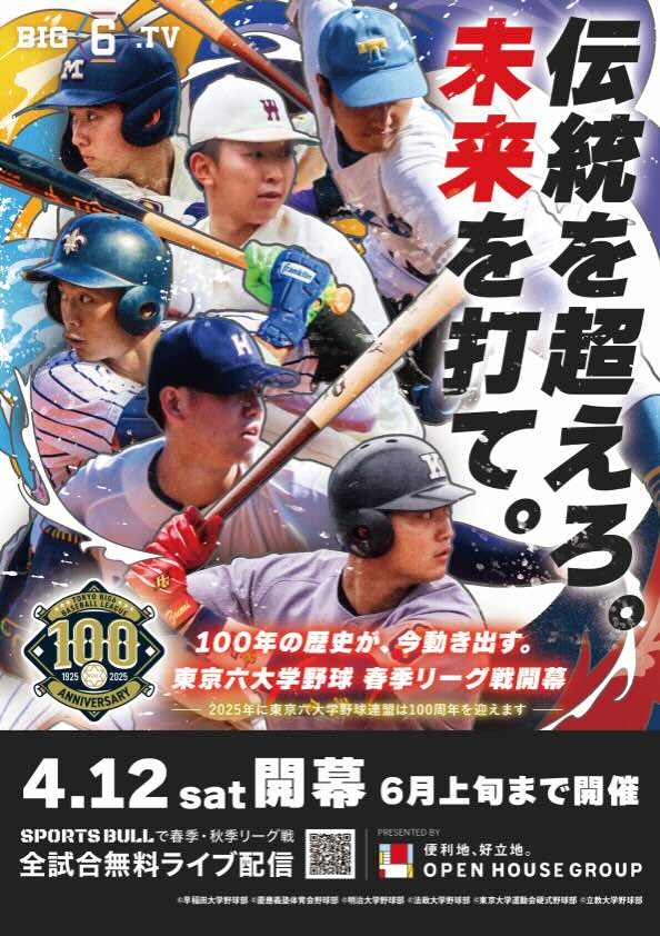 株式会社運動通信社(本社:東京都港区、代表取締役:⿊⾶功⼆朗)と株式会社スポーツマーケティングラボラトリー(本社:東京都港区、代表取締役:荒⽊重雄)は、⼀般財団法⼈東京六⼤学野球連盟(以下「同連盟」)公認のもと、同連盟が主催する東京六⼤学野球2025リーグ戦について、運動通信社が運営するスポーツメディア「SPORTS BULL(スポーツブル)」内の「BIG6.TV(ビッグシックスティービー)」(https://sportsbull.jp/big6tv/)にて、4月12日の開幕戦より全試合無料ライブ配信します。
