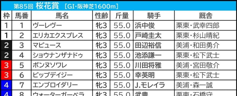 JRAは10日、第85回桜花賞(GI、芝1600m)の枠順を発表した。