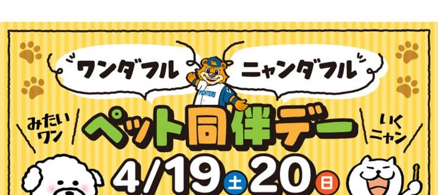 日本ハムは10日、2軍本拠地・鎌ケ谷スタジアムで行われる19、20日のイースタン・リーグ、オイシックス戦で、愛犬や愛猫と一緒に試合を観戦できる「ペット同伴デー」を開催すると発表した。