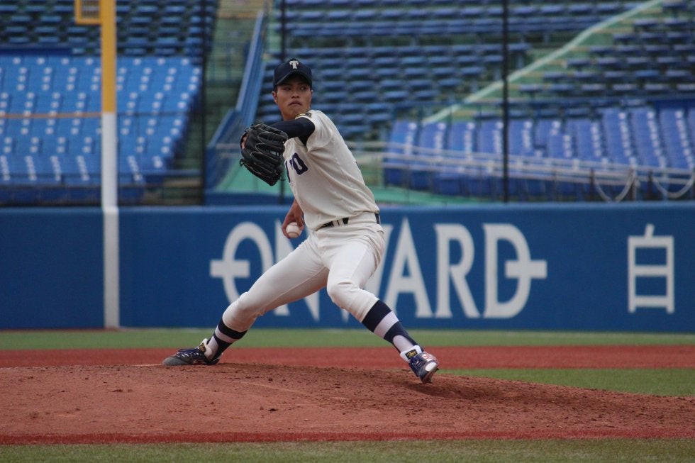 東洋大・甲斐野央投手(3年・東洋大姫路)は5回途中から好投を続けていたが、最後は痛恨の暴投で敗戦を喫した。
