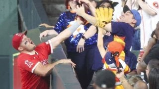 グラブを掴まれ、ボールを奪われるトラウト。(C)Getty Images 予期せぬ妨害に、さしもの大スターも怒った。現地…