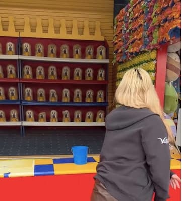 ロサンゼルスの遊園地で的当てゲームに挑戦する動画を投稿。