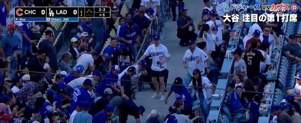 ドジャースの大谷翔平投手がカブス戦に「1番・DH」でスタメン出場。第1打席で放ったファールボールをきっかけに、観客席では“背番号17”のユニフォームを着たファンたちによる、さながらミニゲームのような争奪戦が繰り広げられた。