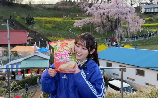 「福島県の三春滝桜を見に行ってきました🌸夜桜が圧巻で、美味しいものも沢山いただきました😋じゃんけんが強いかもしれません 配信をご覧いただきありがとうございました!!✨」と、出演したライブ配信について感謝を伝えるとともに、壮大な桜を背景に田楽を食べる写真などを4枚投稿した。特にライトアップされた夜桜との写真は圧巻の美しさである。