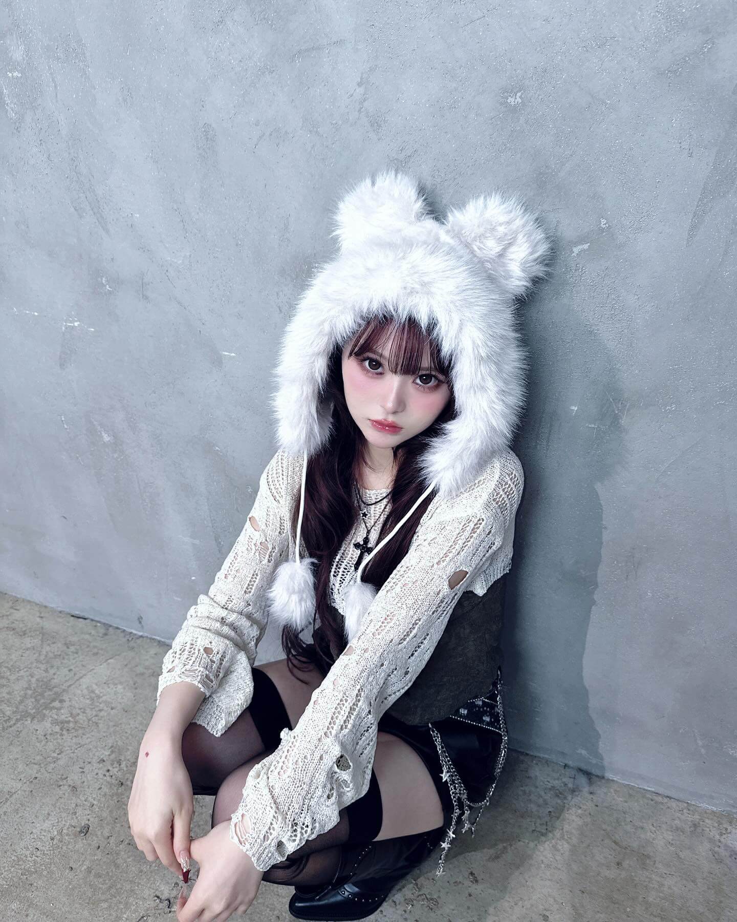 白いふわふわの被り物を身に着けたオフショットを公開。