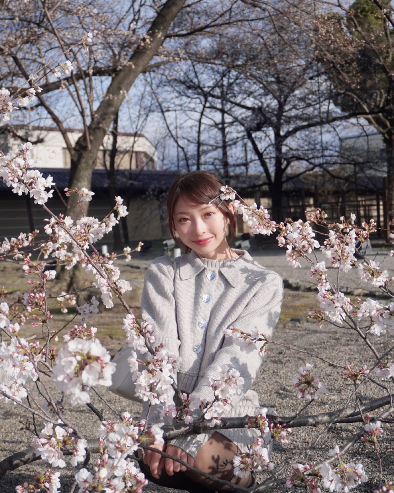 美しい桜とのショットや、わらび餅を美味しそうに眺めるショットを公開した。