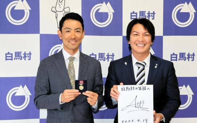 ソチ(2014年)と平昌(18年)の冬季五輪で、2大会連続の銀メダリストになったノルディック複合の渡部暁斗選手(36)が14日、出身地の長野県白馬村を訪れ、丸山俊郎村長と懇談した。