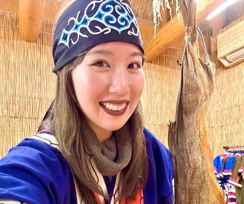 「『アイヌ文化』を学び伝承する24歳🌀 某 漫画に影響され、今夜は"ヒンナヒンナ"の鮭いただきます😃🙏」と語るとともに、『ゴールデンカムイ』に登場するアシㇼパを連想させるようなアイヌの民族衣装姿の写真を投稿した。