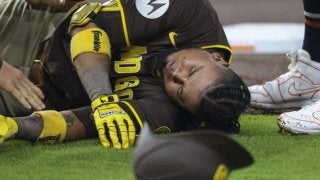 アラエスが走塁中に相手野手と激突した(C)Getty Images パドレスのルイス・アラエスが現地時間4月20日(日本…