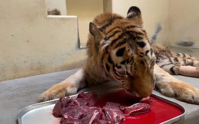 「#アムールトラ 『ココア』へたくさんの温かい応援、本当にありがとうございます。4月22日午後3時より展示を再開しました。お肉を食べるココアです。」という紹介とともに、”ココア”の動画を投稿した。