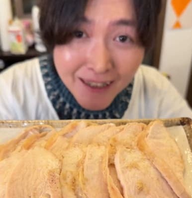 どうやらサラダチキンの作り方を紹介しているようだ。手で簡単に割くことができるとは・・・口に入れたときに柔らかな食感をものすごく感じることができそうだ。とても美味しそうなサラダチキンである。