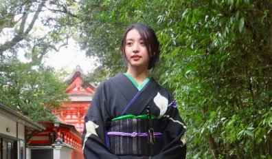 投稿では「お着物の写真」という一文とともに、黒を基調にしたシックな着物姿を披露。百合の花があしらわれた上品な一着に身を包み、神社の参道で静かに立つ姿はまさに“和の美”そのもの。凛とした佇まいと自然の風景が見事に調和し、見た者を引き込む一枚となっている。ヘアメイクは「@mikako888」への感謝も添えられており、細部にまでこだわった仕上がりだ。