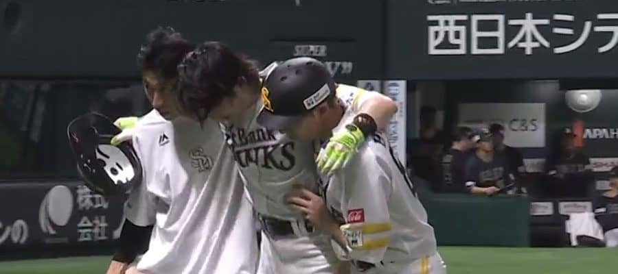 6回2死三塁から権田の直球が直撃。周東は苦悶の表情でその場に倒れこんだ。立ち上がったが歩くことが出来ず、トレーナーらに両肩を支えられてベンチへ下がった。代走に牧原大成内野手が送られ、周東は交代となった。