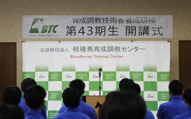 公益財団法人 軽種馬育成調教センター(草野広実理事長)が行う育成調教技術者養成研修の第43期開講式が22日、浦河町のうらかわ優駿ビレッジAERU(アエル)で行われた。