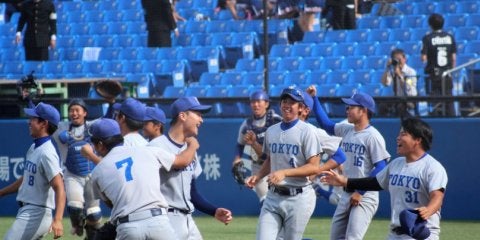 15年ぶりに勝ち点を奪った東大。宮台を中心に歓喜の輪が広がる 東大が8対7で法大を退け、2002年秋以来15…