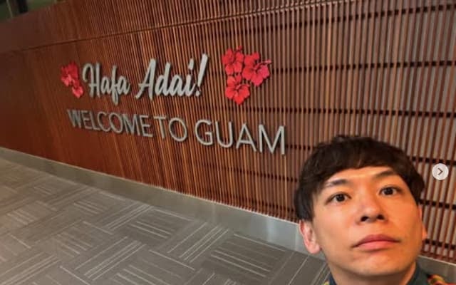 WELCOME TO GUAMと書かれた壁をバックに石井の姿を収めた写真などを投稿した。