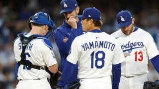 初回から投手コーチがマウンドに行くシーンも(C)Getty Images ドジャースの山本由伸は25日(日本時間26日)…