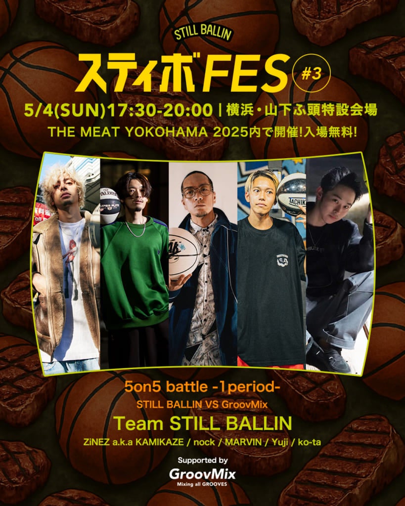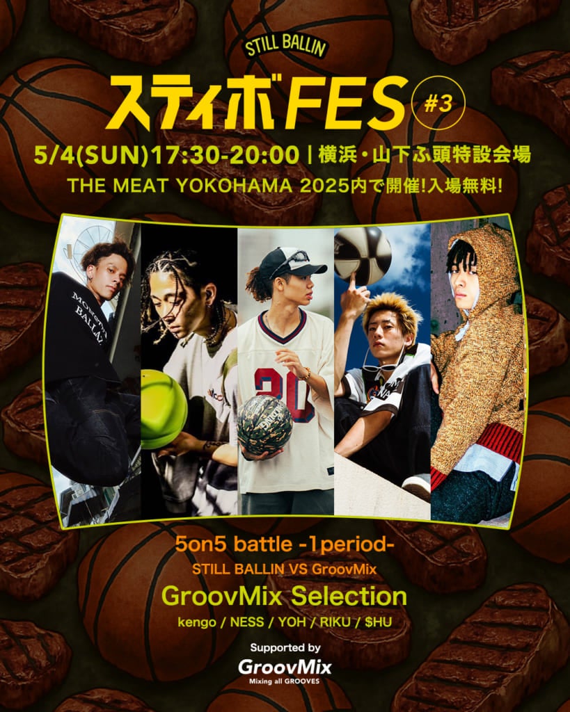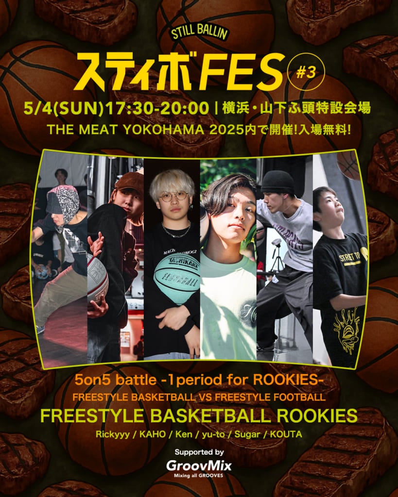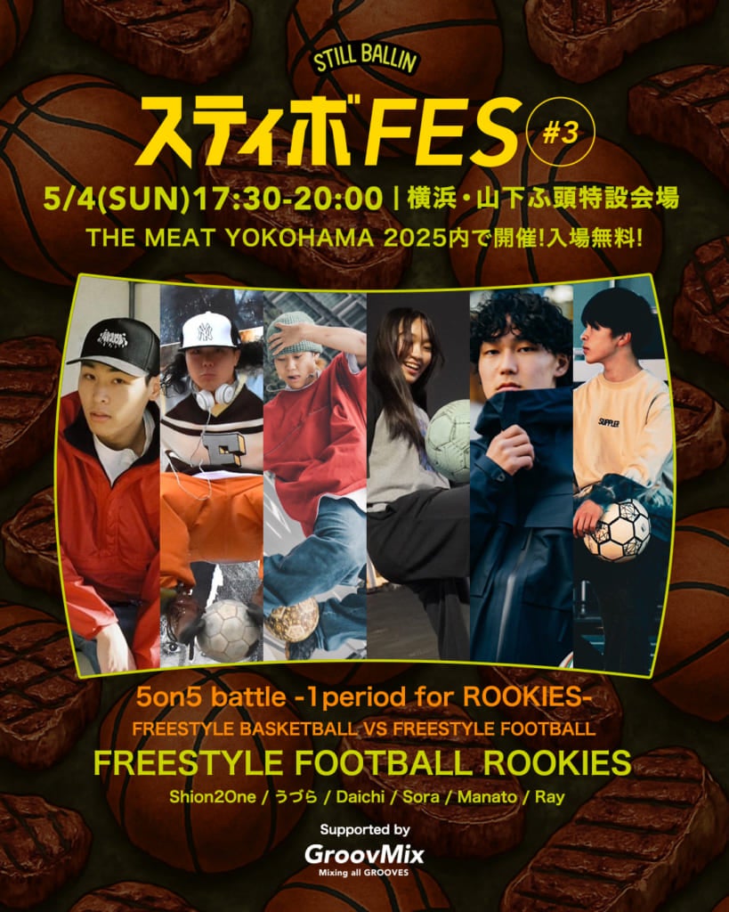 今回は、フリースタイルバスケバトルイベント 「GroovMix」 が企画協力として参戦!よりアツく、より深く、フリースタイルバスケの魅力を掘り下げる。さらに今回は、初の野外開催!舞台は横浜で開催されるフードフェス 「THE MEAT YOKOHAMA 2025」 の会場内。
