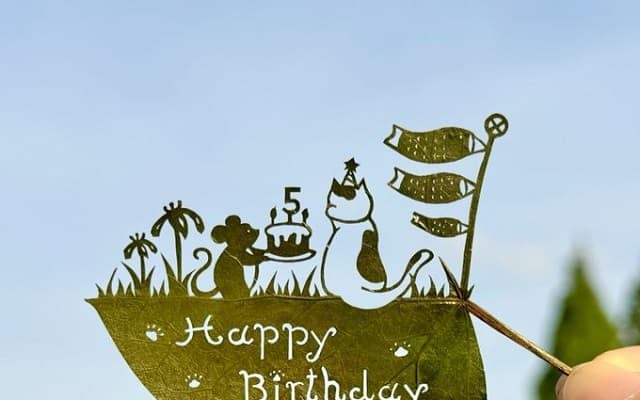 「5月生まれの君におめでとう」という言葉とともに、葉っぱで作られた切り絵の写真を投稿。