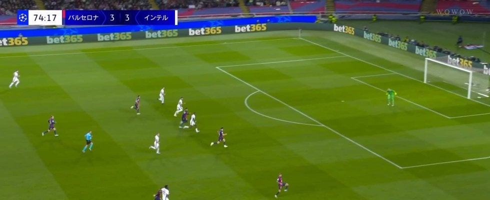 ハイラインを敷くバルセロナのディフェンスに対して、インテルは右サイドから素早く攻め込む。するとデンゼル・ダンフリースが入れた低弾道の鋭いクロスが、DFラインとGKの間を抜けてファーサイドへ。これをヘンリク・ムヒタリアンが押し込んで、インテルが勝ち越しに成功したかと思われた。