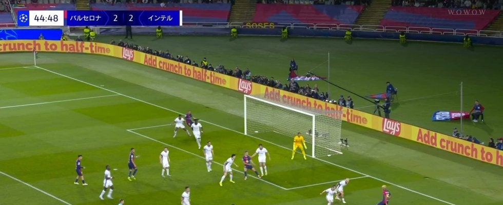 スタジアムがヤマルのテクニカルなプレーに大歓声で熱狂する中、実況・西岡明彦氏は「バックステップ。インテルのディフェンスは飛び込めません」と伝えた。