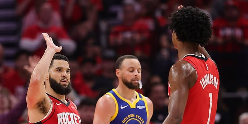 第3クォーターはさらに激しい打ち合いとなり、ロケッツはフレッド・バンブリートやジャバリ・スミスJr.が3ポイントシュートを次々ヒット。第4クォーターではロケッツがフリースローや3点弾でジワジワとリードを広げ、ウォリアーズのオフェンスも停滞させていく。残り1分半には互いに主力を下げ終わり、最終スコア115-107でロケッツが勝利をつかんだ。