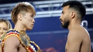 公開計量でカルデナスと視殺戦を繰り広げた井上。(C)Getty Images 怪物がふたたびボクシングの本場に降臨する。…