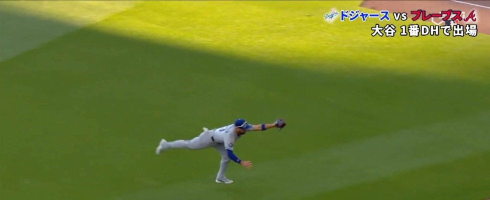 0ー2とドジャースが2点ビハインドで迎えた2回裏、1死二塁の場面。ブレーブスの7番打者・ホワイトが放ったライナー性の打球がレフトを襲う。長打になるかと思われた瞬間、レフトを守るコンフォートが左手を大きく伸ばして後方へダイブ。ボールは見事にグラブに収まり、大ファインプレーとなった。このプレーに球場も騒然となった。