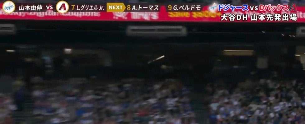 注目のシーンは、ダイヤモンドバックスの2回裏の攻撃のことだった。2死一塁でルルデス・グリエル(グリエルJr.)外野手に打席が回ると、その初球に珍プレーが発生した。 山本が投じた145キロの外角へのカットボールを空振りすると、バットが手からすっぽ抜けて三塁ファールゾーンへ。誰にも当たらなかったため大きな問題とはならなかったが、吹っ飛んだコースが少しでも違えば怪我人が出てもおかしくない危ないシーンだった。