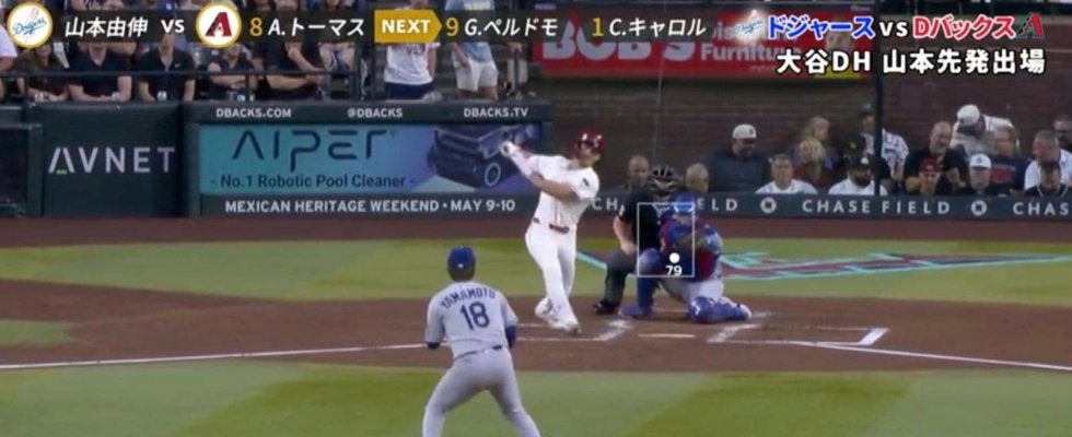 打率3割に迫る好調のメキシコ代表打者を相手に、山本は3-1とカウントで優位に立てていなかった。しかし、続く5球目に79.3マイル(約127.6キロ)のカーブを投げると、トーマスは思わずハーフスイング。このボールはカウント1-0の場面ではギリギリのところでスイングを止めてボールになっていたものの、今度はこらえることができなかったようだ。