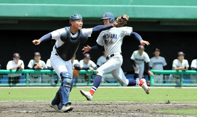 春の県大会優勝の宮崎商は10日に横浜と対戦し、5対10で敗れた。九回2死満塁の好機で2点適時打を放った水谷友哉主将は「ここで打てなかったら終わりと自分を鼓舞して食らいついた」。捕手として「(横浜の打者は)内角も外角もどっちも対応するバッターが多い」と振り返った。