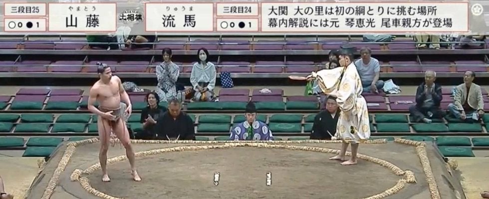 三段目二十五枚目・山藤(出羽海)と三段目二十四枚目・流馬(放駒)の一番。平成15年(2003年)生まれ21歳の山藤は、身長181.6センチ・体重74.2キロの力士としては珍しくスレンダーな体格の持ち主。対戦した流馬は身長181.6センチ・体重147.8キロの巨漢で、体重差は73.6キロと実に2倍近くにも及んだ。