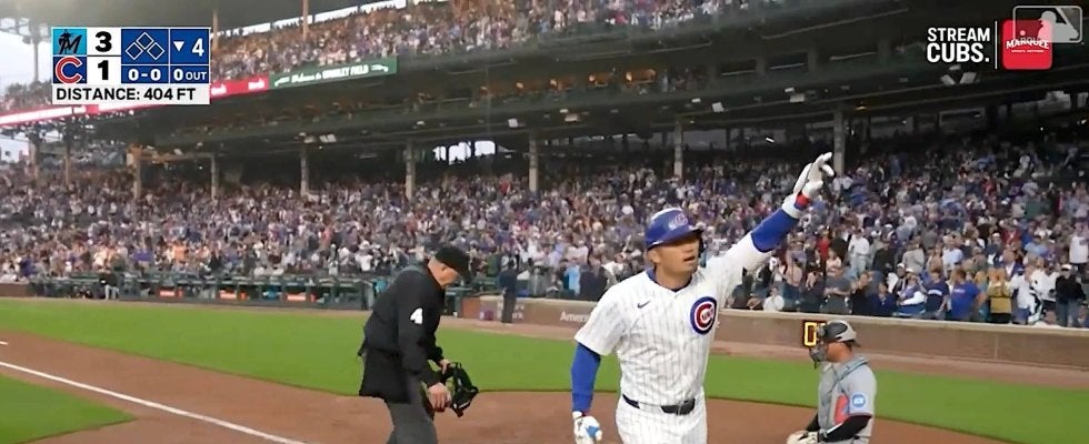 打った瞬間からスタジアムは大歓声に包まれ、着弾と同時にレフトスタンドの観客たちは総立ちでバンザイをするなど大盛り上がりに。熱量高いスタジアムに呼応するようにカブスベンチでも、多くの選手が並んで「ワッショイ!ワッショイ!」と両手を上げ下げする"珍ポーズ"を見せるなどお祭り騒ぎとなった。