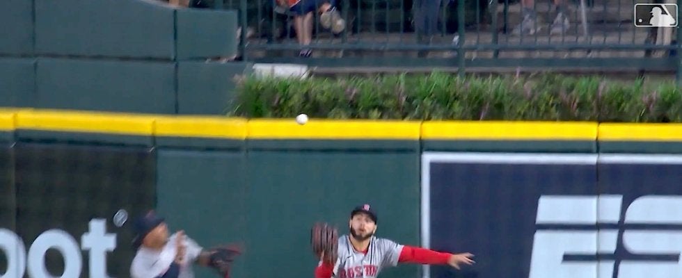 打球速度104.8マイル(168.7キロ)の鋭い当たりは右中間へ一直線。ぐんぐん伸びる打球を追いかけるライトのアブレイユは、フェンス際でボールの落下に合わせてジャンプする。すると、フェンスの黄色ラインを超えていた打球だったが、ボールはアブレイユのグラブへ。ところが掴み損ねてボールが飛び出してしまった。