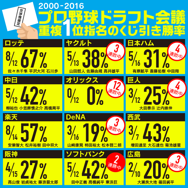 逆にまったくツイていないのがオリックス。近鉄時代を含めると現在12連敗中(オリックス・バファローズとなってからは11連敗)で、2013年以降は競合が確実視される人気選手を避けて一本釣りを狙うケースが増えています。同じく一本釣り志向の強い西武も2013年以降くじ引きに参加していませんが、2009年に6球団競合の菊池雄星、2010年に6球団競合の大石達也を引き当てる剛腕ぶりを見せています。清宮獲りに参戦となると注目したい球団のひとつです。
