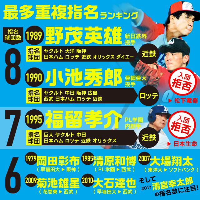 これまで最も多くの指名を集めた選手は、1989年の野茂英雄(新日鉄堺)と1990年の小池秀郎(亜細亜大)の8球団です。1988年のソウルオリンピック日本代表として銀メダル獲得に貢献するなど、社会人野球屈指の剛腕として鳴らした野茂は近鉄が交渉権を獲得。1年目から沢村賞を獲得するなど数々の偉業を達成し、またメジャーリーグ挑戦の実質的なパイオニアとしても広く知られています。