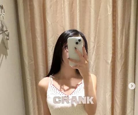 白地に赤い模様が入った涼しげなセットアップを身にまとい、写真にはブランド「CRANK」の文字が入っている。
